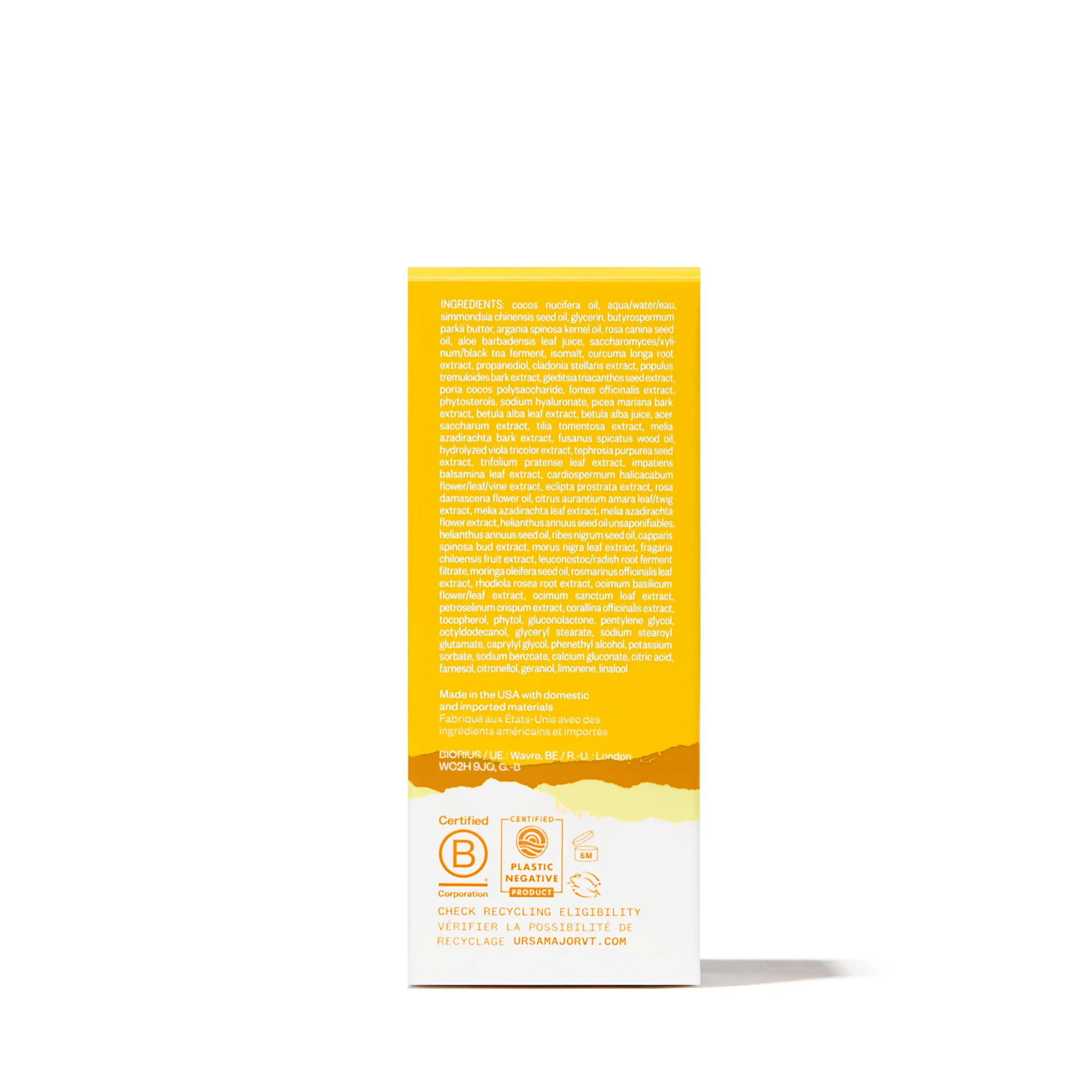 cocos nucifera oil, water (aqua), simmondsia chinensis (jojoba) seed oil*, glycerin, butyrospermum parkii butter*, argania spinosa kernel oil*, rosa canina seed oil, aloe barbadensis leaf juice,saccharomyces/xylinum/black tea ferment, isomalt, curcuma longa root extract, propanediol,cladonia stellaris extract, populus tremuloides bark extract, gleditsia triacanthos seed extract, poria cocos polysaccharide, fomes officinalis extract, phytosterols, sodium hyaluronate, picea mariana bark extract, pinus banksiana bark extract, betula alleghaniensis bark extract, betula alba leaf extract, betula alba juice, acer rubrum bark extract, acer saccharum (sugar maple) sap extract, tilia tomentosa extract, melia azadirachta bark extract, fusanus spicatus wood oil, hydrolyzed viola tricolor extract, tephrosia purpurea seed extract, trifolium pratense leaf extract, impatiens balsamina leaf extract, cardiospermum halicacabum flower/leaf/vine extract, eclipta prostrata extract, rosa damascena flower oil, citrus aurantium flower oil, melia azadirachta leaf extract, melia azadirachta flower extract, helianthus annuus seed oil unsaponifiables, helianthus annuus (sunflower) seed oil, ribes nigrum seed oil, capparis spinosa bud extract, morus nigra leaf extract,fragaria chiloensis fruit extract, leuconostoc/radish root ferment filtrate, moringa oleifera seed oil,rosmarinus officinalis leaf extract, rhodiola rosea root extract, ocimum basilicum flower/leaf extract,ocimum sanctum leaf extract, petroselinum crispum extract, corallina officinalis extract,tocopherol, phytol, gluconolactone, pentylene glycol, octyldodecanol, glyceryl stearate, sodium stearoyl glutamate, caprylyl glycol, phenethyl alcohol, potassium sorbate, sodium benzoate,calcium gluconate, citric acid, farnesol, citronellol, geraniol*