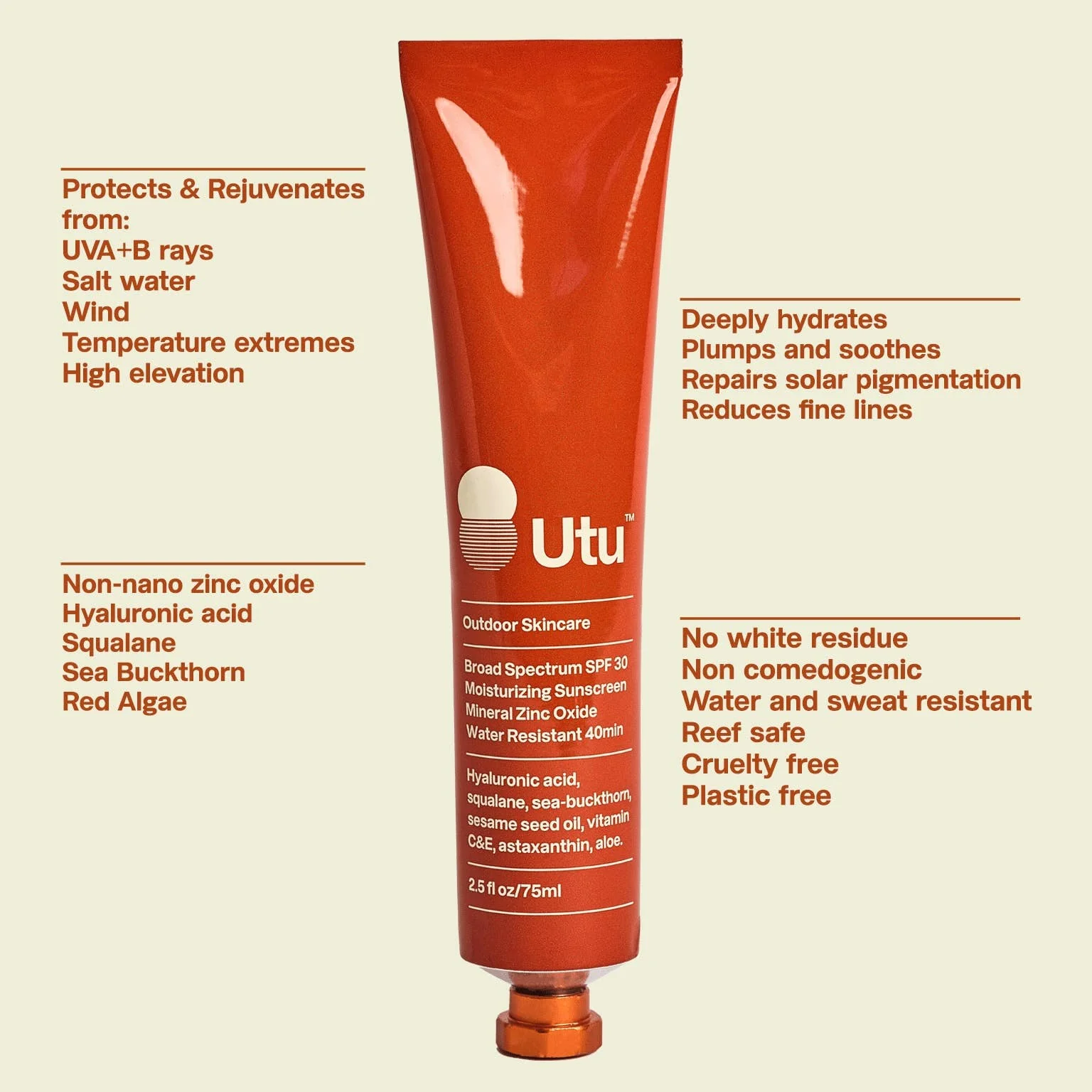 Utu's advanced SPF30 (Broad Spectrum) Moisturizing Mineral Sunscreen. Formulated with deeply nourishing and rejuvenating Hyaluronic Acid, Squalane and Sea Buckthorn. Blends seamlessly, and leaves skin feeling supple and radiant with no white cast. Unscented. Water resistant 40 min. Zero Plastic brand.